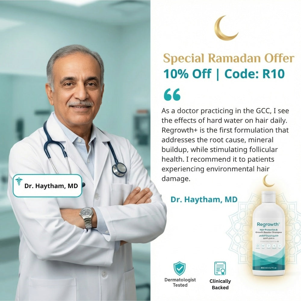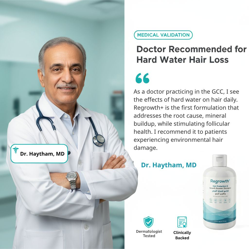 Most shampoos, even premium ones, are formulated for soft water. They can't address the mineral buildup unique to desalinated water in the GCC. Regrowth+ combines chelating technology (to neutralize daily mineral deposits) with clinical-grade growth actives (caffeine, rosemary, argan & shea) for a complete scalp-level solution.