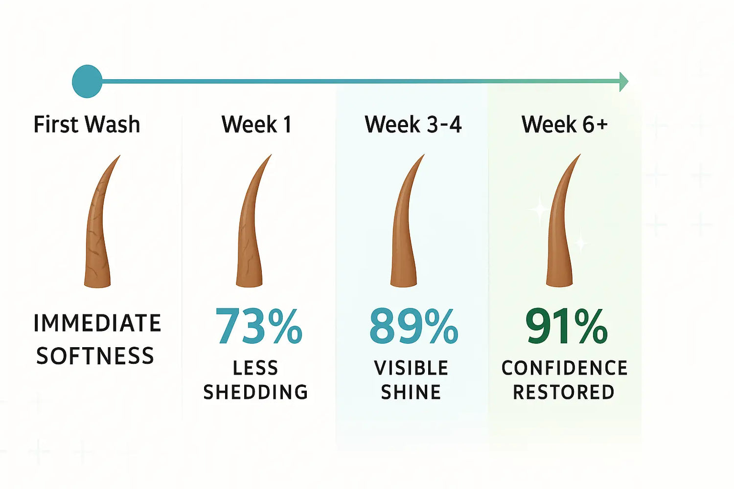 Most users notice less shedding within the first week. Visible improvements in hair texture, shine, and thickness typically appear by weeks 3-4. For maximum regrowth and strength restoration, we recommend consistent use for 6-8 weeks. Think of it as a compound effect, results build over time