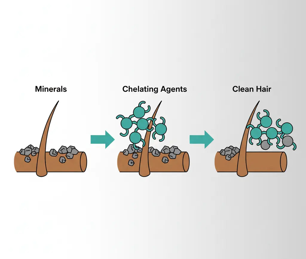 Actively binds to and removes calcium and magnesium minerals that coat your hair with every shower. Prevents the brittle 'mineral cast' that makes hair dry, dull, and prone to breakage.